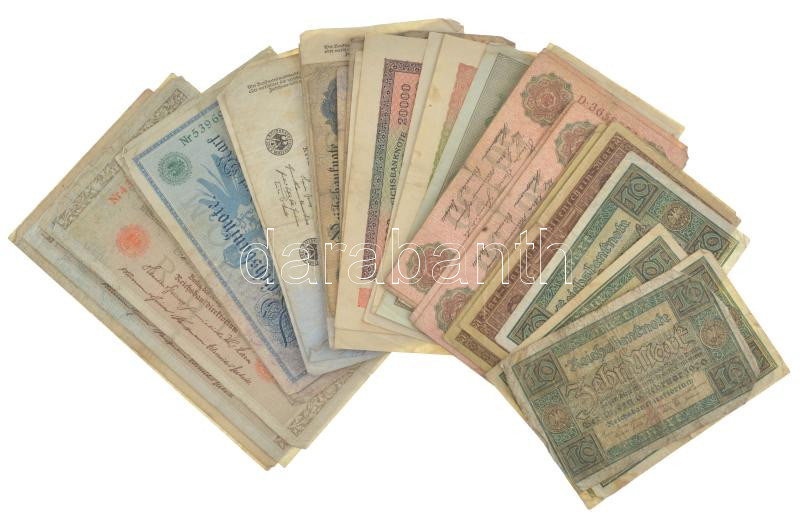 Németország ~1910-1920. 50 darabos vegyes német bankjegy tétel (10xklf) T:III,III- közte tűlyuk, folt, szenny., szakadás, lyuk, saroktörés Germany ~1910-1920. 50 pieces mixed german banknote lot (10xdiff) C:F,VG include needle hole, spotted, dirty, torn,