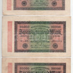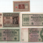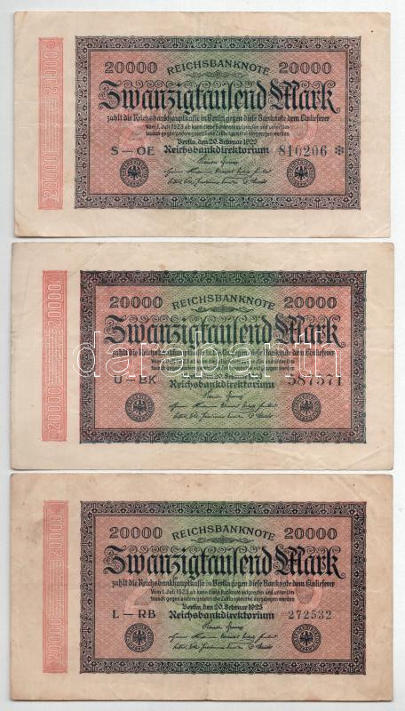 Németország / Weimari Köztársaság 1920. 2M + 1922. 1000M (2x) + 5000M + 1923. 20.000M (3x) + 1933. 50M T:III,III- folt, kis szakadás Germany / Weimar Republic 1920. 2 Mark + 1922. 1000 Mark (2x) + 5000 Mark + 1923. 20.000 Mark (3x) + 1933. 50 Mark C:F,VG