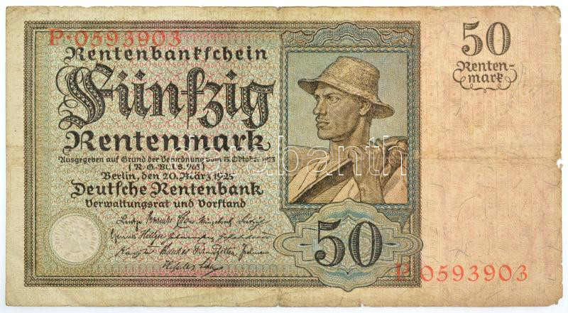 Németország / Weimari Köztársaság 1925. 50M T:III- / Germany / Republic of Weimar 1925. 50 Rentenmark C:VG Krause P#171<a href="https://www.darabanth.com/hu/gyorsarveres/438/kategoriak~Numizmatika/Kulfoldi-bankjegyek~1500013/Nemetorszag-Weimari-Kozt