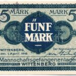 Németország / Wittenberg hadifogolytábor 1916. április 1. 5M ‘037604’ sorszámmal vízjeles papíron, felülbélyegzéssel érvénytelenítve T:II Germany / Wittenberg POW Camp 1916. April 1. 5 Mark ‘037604’ on watermarked paper, cancelled by