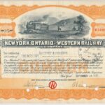 New York 1932. ‘New York, Ontario és a Nyugati Vasút Társaság’ 25 részvénye 2500$-ról ‘B74905’ felülbélyegzésekkel, lyukasztással, perforációval érvénytelenítve T:III USA / New York 1932. ‘New York, Ontario and Western Railway Company’ 25 shares about 25