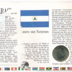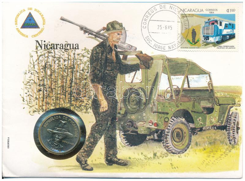 Nicaragua 1983. 1C Cu-Ni felbélyegzett borítékon, bélyegzéssel, német nyelvű leírással (leírás sérült) T:1 kis patina Nicaragua 1983. 1 Cordoba Cu-Ni in envelope with stamp, with German description (description damaged) C:UNC small patina<a href="ht
