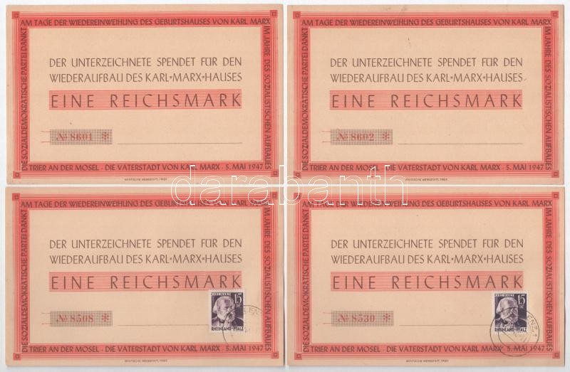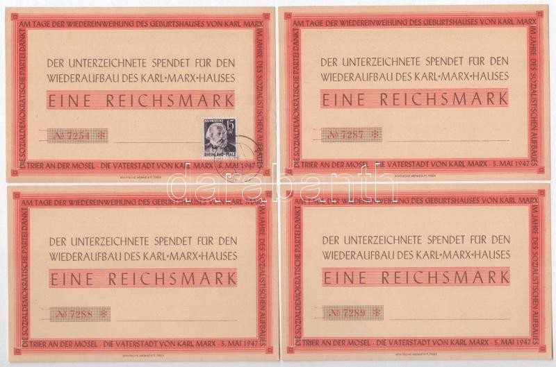 NSZK 1947. ‘A Karl Marx Ház újjáépítésére’ kitöltetlen téglajegy (8x) közte sorszámkövető és lebélyegzett darabok T:I,I- FRG 1947. ‘Wiederaufbau des Karl Marx Hauses’ unfilled brick ticket (8x) within consecutive serials and stamped pcs C:UNC,AU<a h