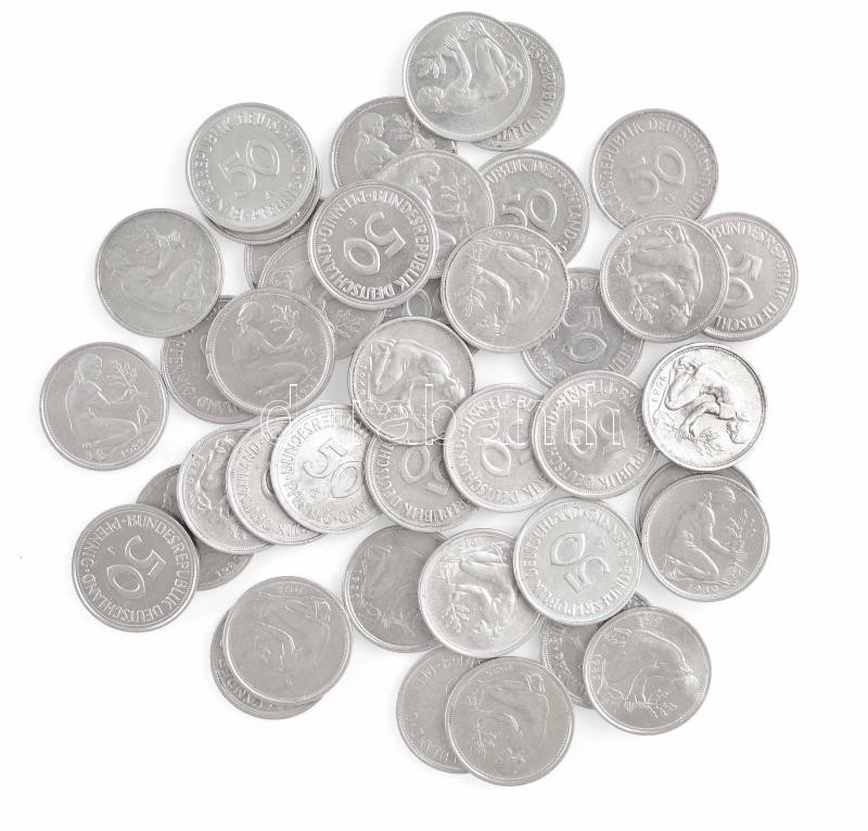 NSZK 1949-1993. 50pf Cu-Ni (41xklf) T:1–3 GFR 1949-1993. 50 Pfennig Cu-Ni (41xdiff) C:AU-F Krause KM#104, KM#109<a href="https://www.darabanth.com/hu/gyorsarveres/411/kategoriak~Numizmatika/Kulfoldi-fem-es-ezustpenzek~2000022/NSZK-1949-1993-50pf-Cu