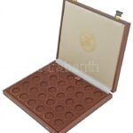 NSZK ~1985. éremtartó doboz az ezüst 5 Márkás érmékhez, egy kivehető tálcával, összesen 60db, 29mm-es férőhellyel, haszánált de jó állapotban