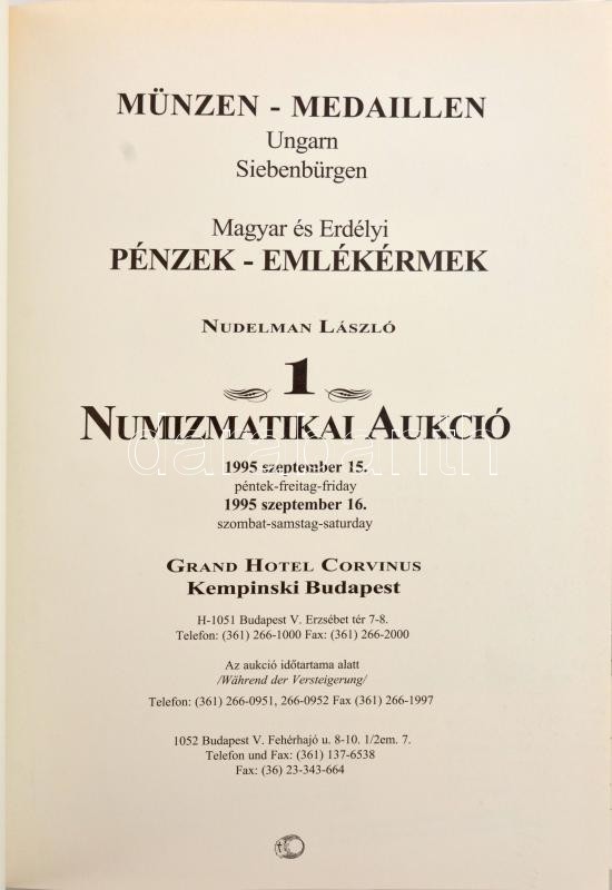 Nudelman László: Magyar és Erdélyi Pénzek-Emlékérmek – 1. Numizmatikai Aukció – 1995 szeptember 15. péntek és 1995 szeptember 16. szombat, Grand Hotel Corvinus Kempinski Budapest. Kitöltetlen vételi megbízási lappal, elkelt árlistával. Jó állapotú, haszná