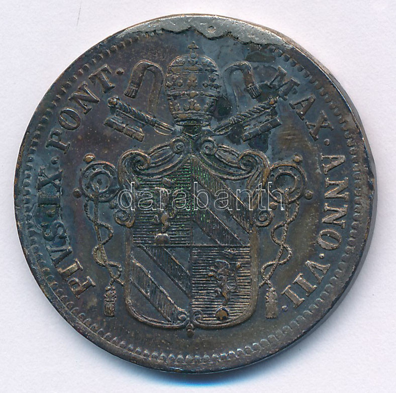 Olasz Államok / Pápai Államok 1853R 1b Cu ‘IX. Pius’ T:VF patina, lapka hiba Italian States / Papal States 1853R 1 Baiocco Cu ‘Pio IX’ C:VF patina, planchet error Krause KM#1345<a href="https://www.darabanth.com/hu/gyorsarveres/440/kategoriak~Numizm