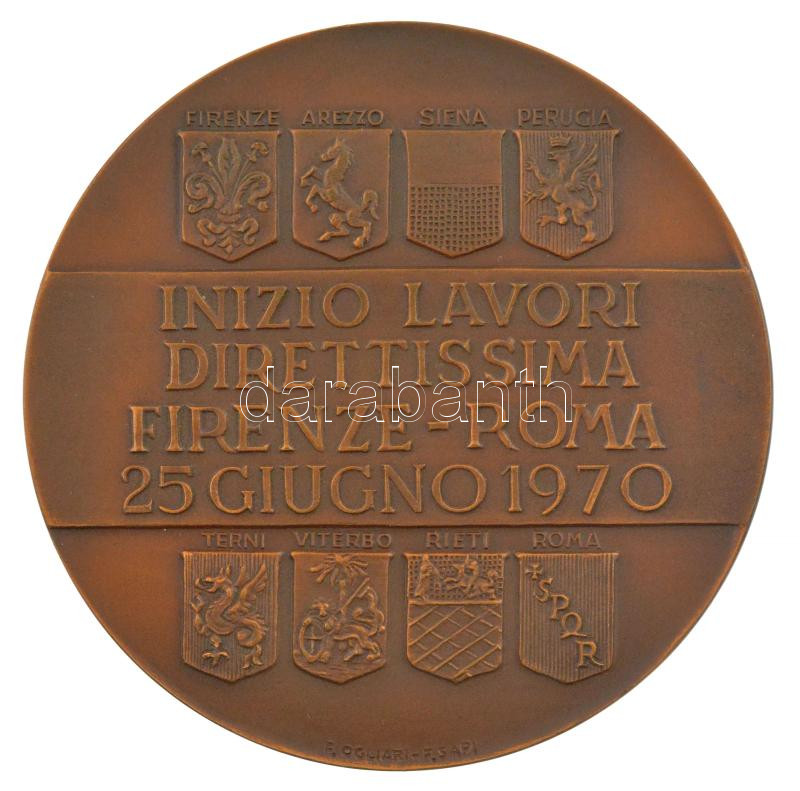 Olaszország 1970. ‘A Firenze-Róma közti közvetlen vasútvonal építésének kezdete – 1970. Június 25.’ kétoldalas bronz emlékérem ‘S. Johnson’ gyártói jelzéssel, eredeti filc tokban. Szign.: F. Ogliari, F. Sapi (80mm) T:1 Italy 1970.