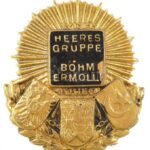 Osztrák-Magyar Monarchia 1914-17. ‘Böhm Ermolli Hadseregcsoport – Világháború’ aranyozott fém sapkajelvény, részben zománcozott (34x30mm) T:2 zománchiba Austro-Hungarian Monarchy 1914-17. ‘HEERES GRUPPE BÖHM ERMOLLI WELTKRIEG’ gold