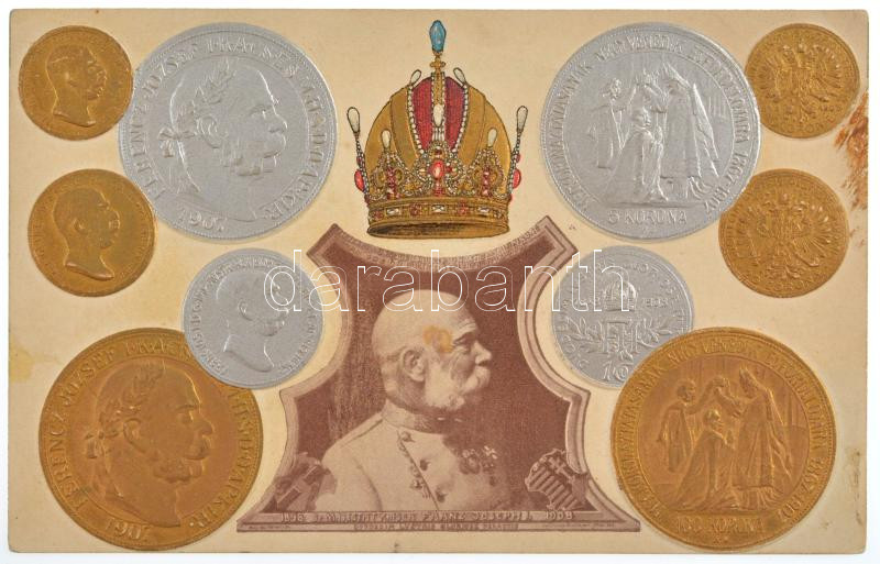 Osztrák-Magyar pénzérméket és Ferenc Józsefet ábrázoló osztrák kiadású képeslap, ezüstözött és aranyozott dombornyomott, litográf képeslap Postcard with Austro-Hungarian coin issues and portrait of Franz Jopseph. Lithography