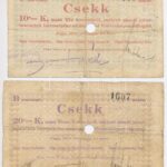 Pápa 1919. május 8. ‘Pápai csekk’ 10K + 20K, mindkettő lyukasztással érvénytelenítve és ovális szárazbélyegzővel (egyiken a bélyegző a papírt átszakította), B és C sorozat T:III Adamo PÁP-1.1.1, 1.2.1<a href="https://www.darabanth.com/hu/gyorsarvere