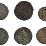 Római Birodalom 6db-os érmetétel a III-IV. századból vegyes állapotban, egyik ezüst T:2–3- patina, anyaghiány Roman Empire 6pcs coin lot from the 3rd-4th century, include a silver one C:VF-VG patina, metal error<a href="https://www.darabanth.com/hu