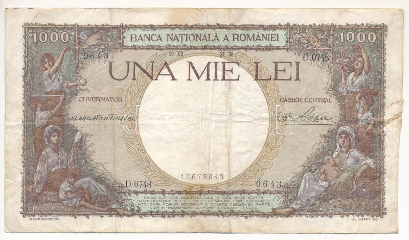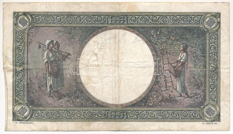 Románia 1938. 1000L T:III- fo. Romania 1938. 1000 Lei C:VG spotted Krause P#46<a href="https://www.darabanth.com/hu/gyorsarveres/432/kategoriak~Numizmatika/Kulfoldi-bankjegyek~1500014/Romania-1938-1000L-TIII-fo-Romania-1938-1000-Lei-CVG-spotted-Krau