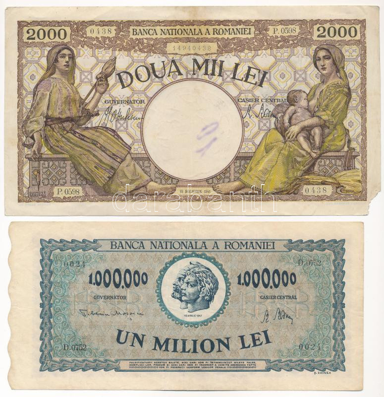 Románia 1941. 2000L + 1947. 1.000.000L T:III egyiken kis anyaghiány, másik szép papír Romania 1941. 2000 Lei + 1947. 1.000.000 Lei C:F one with little missing material, the other fine paper<a href="https://www.darabanth.com/hu/gyorsarveres/434/kateg