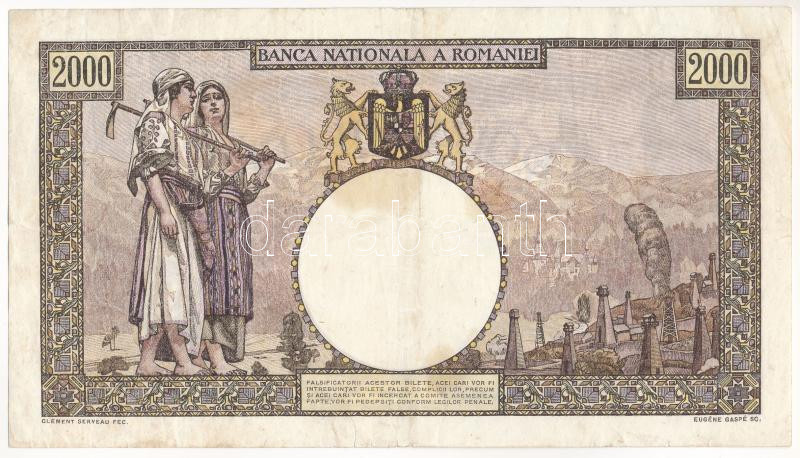Románia 1944. 2000L T:III beszakadások, fo. Romania 1944. 2000 Lei C:F tears, spotted Krause P#54<a href="https://www.darabanth.com/hu/gyorsarveres/433/kategoriak~Numizmatika/Kulfoldi-bankjegyek~2000008/Romania-1944-2000L-TIII-beszakadasok-fo-Romani