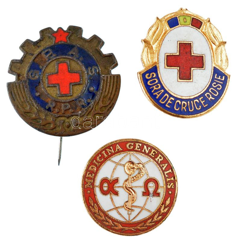 Románia ~1980-1990. ‘A Vöröskereszt ápolója’ zománcozott tombak jelvény + ‘G.P.A.S. – R.P.R. (Egészségügyi Védelem – Román Népköztársaság)’ zománcozott Cu jelvény + ‘Medicina Generalis’ zománcozott tombak jelvény T:1,2-