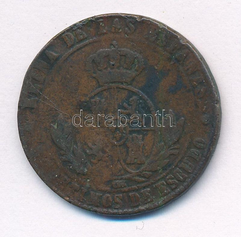 Spanyolország 1868OM 5c Cu ‘II. Izabella’ T:3,3- Spain 1868OM 5 Centimos Cu ‘Isabella II’ C:F,VG Krause KM#635.1<a href="https://www.darabanth.com/hu/gyorsarveres/433/kategoriak~Numizmatika/Kulfoldi-fem-es-ezustpenzek~2000007/Spanyolorszag-1868OM-5c