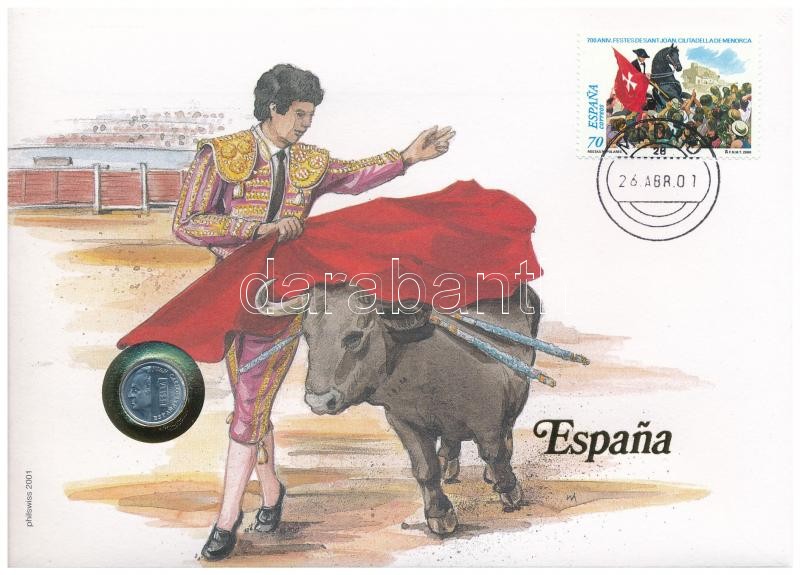 Spanyolország 1998. 1P felbélyegzett borítékban, bélyegzéssel, német nyelvű leírással T:1 Spain 1998. 1 Peseta in envelope with stamp and cancellation, with German description C:UNC<a href="https://www.darabanth.com/hu/gyorsarveres/423/kategoriak~Nu