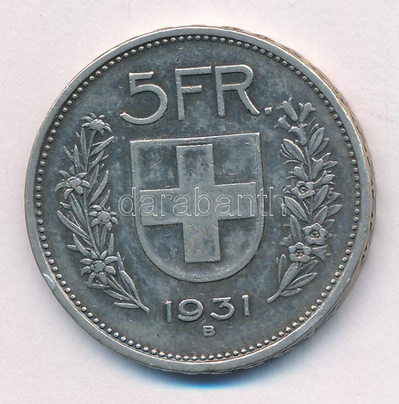 Svájc 1931B 5Fr Ag T:2- patina Switzerland 1931B 5 Francs Ag C:VF patina Krause KM#402<a href="https://www.darabanth.com/hu/gyorsarveres/432/kategoriak~Numizmatika/Kulfoldi-fem-es-ezustpenzek~1500015/Svajc-1931B-5Fr-Ag-T2-patina-Switzerland-1931B-5-