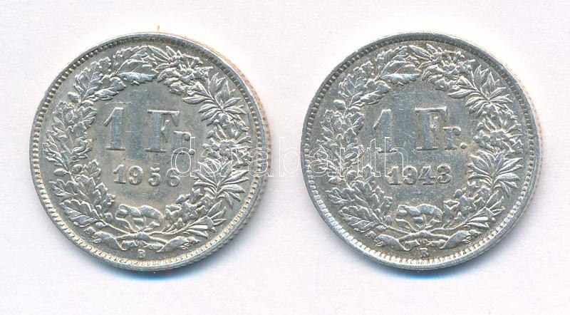 Svájc 1943-1956. 1Fr Ag (2xklf) T:2,2- Switzerland 1943-1956. 1 Franc Ag (2xdiff) C:XF,VF Krause KM#24<a href="https://www.darabanth.com/hu/gyorsarveres/435/kategoriak~Numizmatika/Kulfoldi-fem-es-ezustpenzek~1500031/Svajc-1943-1956-1Fr-Ag-2xklf-T2-2