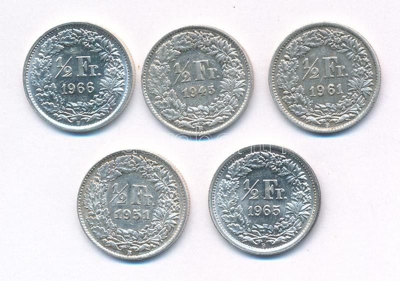Svájc 1945-1966. 1/2Fr Ag (5xklf) T:1-,2 Switzerland 1945-1966. 1/2 Franc Ag (5xdiff) C:AU,XF Krause KM#23<a href="https://www.darabanth.com/hu/gyorsarveres/435/kategoriak~Numizmatika/Kulfoldi-fem-es-ezustpenzek~1500031/Svajc-1945-1966-12Fr-Ag-5xklf