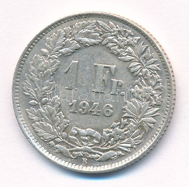 Svájc 1946B 1Fr Ag T:2 patina Switzerland 1946B 1 Francs Ag C:XF patina Krause KM#24<a href="https://www.darabanth.com/hu/gyorsarveres/411/kategoriak~Numizmatika/Kulfoldi-fem-es-ezustpenzek~2000022/Svajc-1946B-1Fr-Ag-T2-patina-Switzerland-1946B-1-Fr