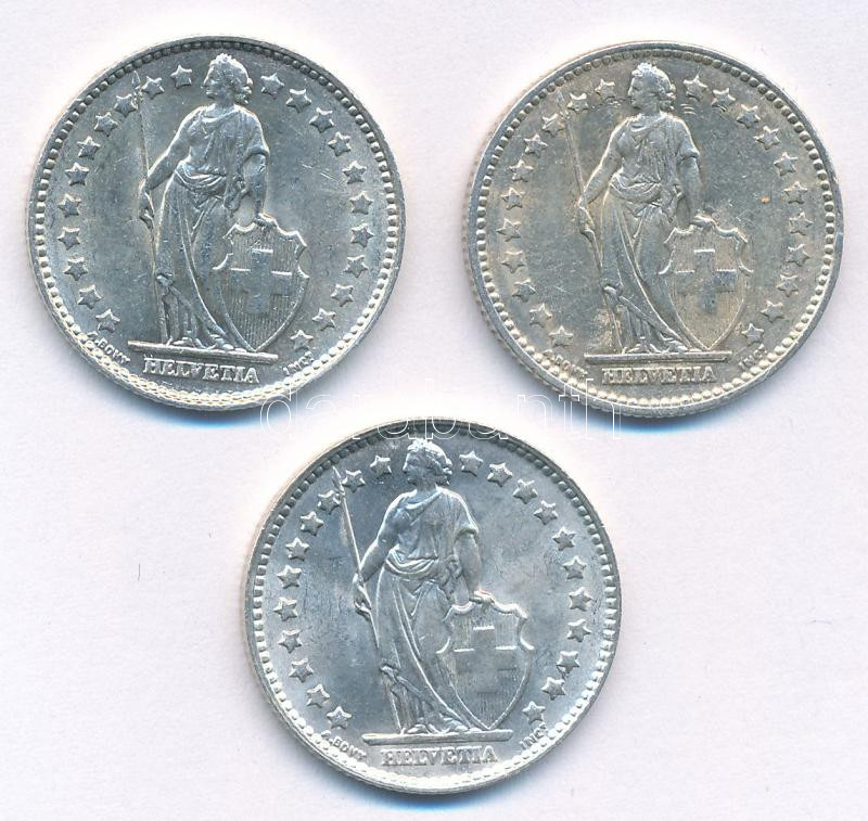 Svájc 1956-1964. 1Fr Ag (3xklf) T:1-,2 Switzerland 1956-1964. 1 Franc Ag (3xdiff) C:AU,XF Krause KM#24<a href="https://www.darabanth.com/hu/gyorsarveres/439/kategoriak~Numizmatika/Kulfoldi-fem-es-ezustpenzek~500014/Svajc-1956-1964-1Fr-Ag-3xklf-T1-2-