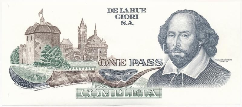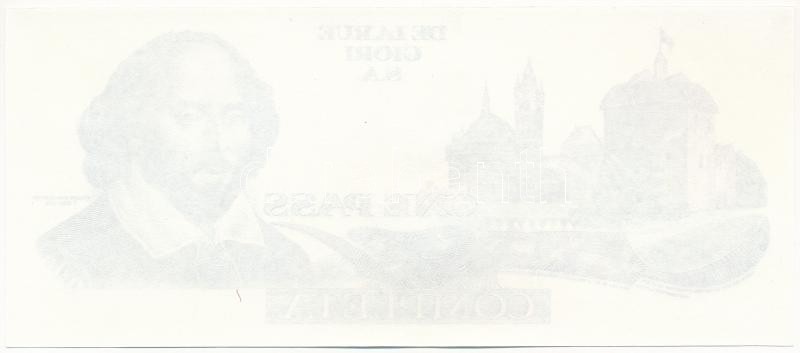 Svájc ~2000. Egyoldalas bankjegy tervezet ‘One Pass (Belépő?)’ nyomattal, ‘Shakespeare’ hátlapi tervezettel, a De La Rue bankjegynyomda kiadásában T:I- / Switzerland ~2000. One-sided test banknote with ‘One Pass (as a ticket?)’ print, with