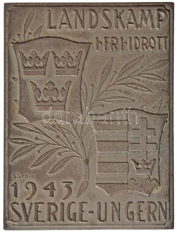 Svédország 1943. ‘Nemzetközi szabadverseny – 1943 Svédország-Magyarország’ ezüstözött bronz atlétikai díjplakett ‘Z Westins Stockholm’ gyártói jelzéssel és ‘4x100m 1. Pris’ gravírozással a hátoldalán. Szign.: S. Skold (60x80mm) T:1-,2 patina Sweden 1943.