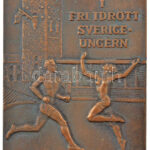 Svédország 1956. ‘Nemzetközi szabadverseny – 1956 Svédország-Magyarország’ bronz atlétikai díjplakett ‘Westins Stockholm’ gyártói jelzéssel és ‘3. Pris Häck 400m’ gravírozással a hátoldalán. Szign.: AH(?) (57x84mm) T:1-,2 Sweden