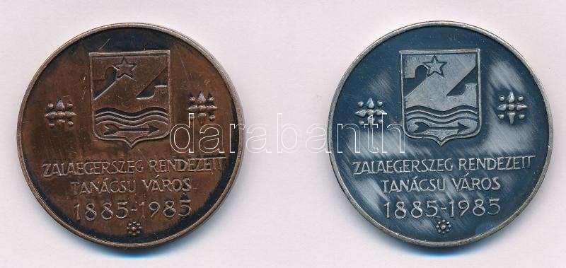 Szabolcs Péter (1942-) 1984. ‘MÉE Zala megyei szervezete – Zalaegerszeg / Zalaegerszeg rendezett tanácsú város 1885-1985’ (2xklf) ezüstpatinázott Br és Br emlékérem pár (42,5mm) T:1- Adamo ZE2<a href="https://www.darabanth.com/hu/gyorsarveres/409/ka