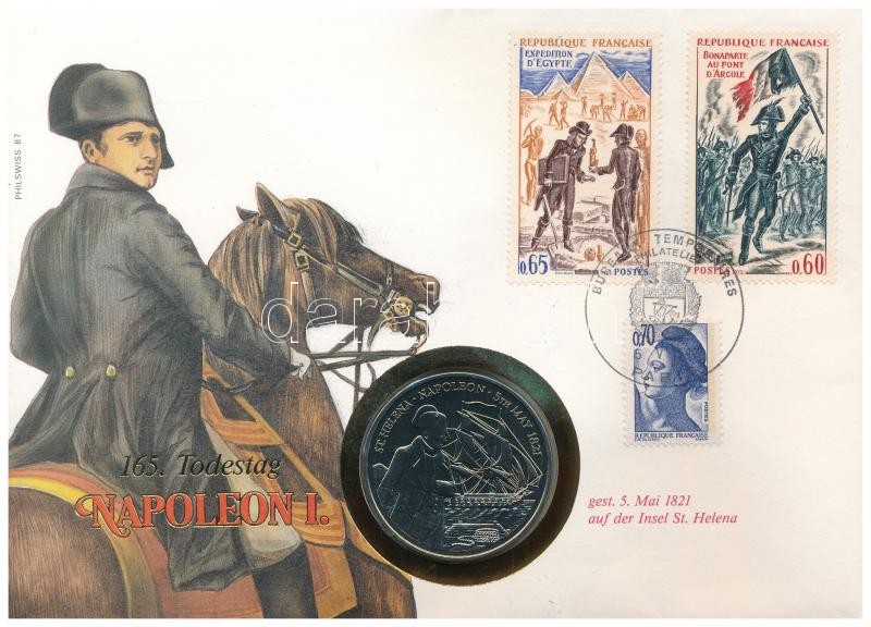Szent Ilona 1986. 50p Cu-Ni ‘Napoleon halálának 165. évfordulója’ érmés, francia bélyeggel felbélyegzett borítékban, alkalmi bélyegzéssel, német nyelvű leírással T:1 St. Helena 1986. 50 Pence Cu-Ni ‘165th anniversary of Napoleon’s
