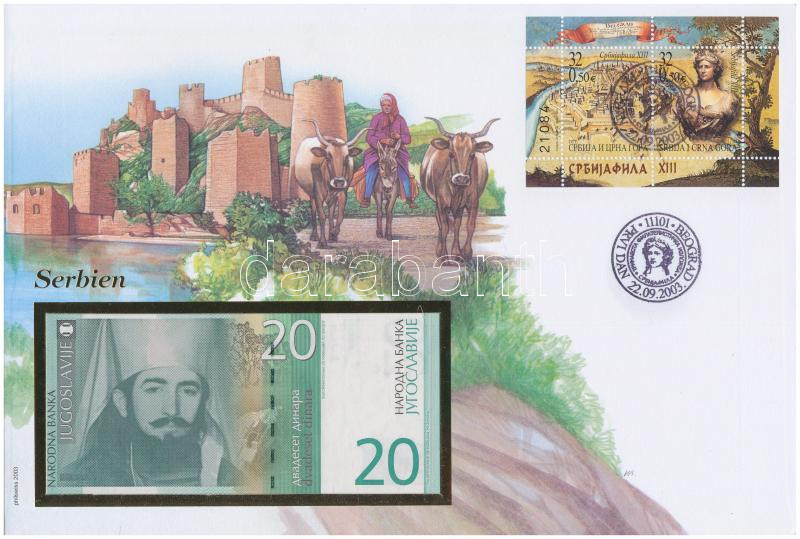 Szerbia 2000. 20D felbélyegzett borítékban, bélyegzéssel T:1 Serbia 2000. 20 Dinara in envelope with stamp and cancellation C:UNC<a href="https://www.darabanth.com/hu/gyorsarveres/431/kategoriak~Numizmatika/Ermes-es-bankjegyes-boritekok~1500004/Sze