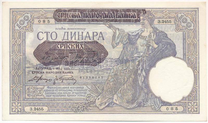 Szerbia / Német megszállás 1941. 100D T:I- Serbia / German Occupation 1941. 100 Dinara C:AU Krause#23<a href="https://www.darabanth.com/hu/gyorsarveres/434/kategoriak~Numizmatika/Kulfoldi-bankjegyek~1500014/Szerbia-Nemet-megszallas-1941-100D-TI-Serb