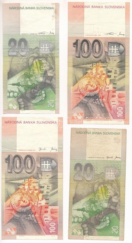 Szlovákia 1997. 20K + 1999. 100K + 2001. 20K + 100K T:III Slovakia 1997. 20 Korun + 1999. 100 Korun + 2001. 20 Korun + 100 Korun C:F<a href="https://www.darabanth.com/hu/gyorsarveres/419/kategoriak~Numizmatika/Kulfoldi-bankjegyek~2000014/Szlovakia-1
