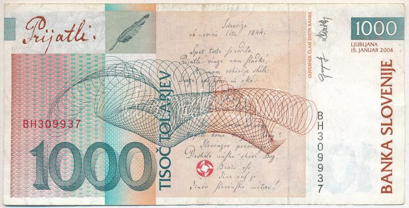 Szlovénia 2004. 1000T ‘BH 309937’ T:F Slovenia 2004. 1000 Tolarjev ‘BH 309937’ C:F Krause P#32b<a href="https://www.darabanth.com/hu/gyorsarveres/439/kategoriak~Numizmatika/Kulfoldi-bankjegyek~500013/Szlovenia-2004-1000T-BH-309937-TF-Slovenia-2004-1