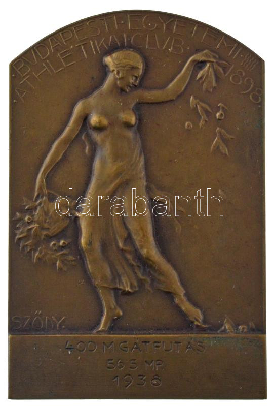 Sződy Szilárd (1878-1939) 1938. ‘Budapesti Egyetemi Athletikai Club’ bronz plakett ‘Ludvig Budapest’ gyártói jelzéssel és ‘400 M GÁTFUTÁS 56.5 MP 1938’ gravírozással (70x46mm) T:2<a href="https://www.darabanth.com/hu/gyorsarveres/436/kategoriak~Numi