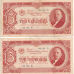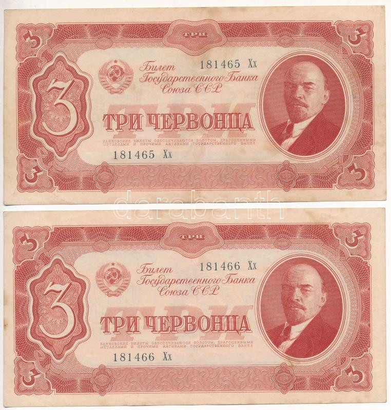 Szovjetunió 1937. 3Ch (2x) sorszámkövetők T:II- Soviet Union 1937. 3 Chervontsa (2x) consecutive serials C:VF Krause P#203<a href="https://www.darabanth.com/hu/gyorsarveres/434/kategoriak~Numizmatika/Kulfoldi-bankjegyek~1500014/Szovjetunio-1937-3Ch-