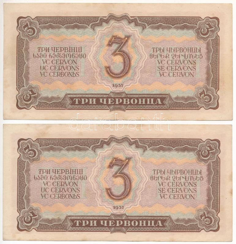 Szovjetunió 1937. 3Ch (2x) sorszámkövetők T:II- Soviet Union 1937. 3 Chervontsa (2x) consecutive serials C:VF Krause P#203