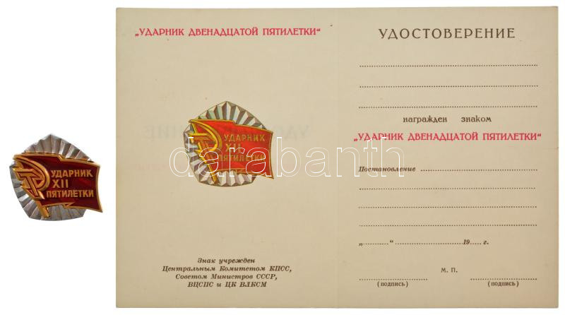 Szovjetunió ~1990. ‘A 12. ötéves terv alatt végzett munkáért’ Al jelvény kitöltetlen igazolvánnyal T:1 Soviet Union ~1990. ‘For Communist Labor during 12th Five-Year Plan’ Al badge with unfilled document C:UNC<a href="https://www.darabanth.com/hu/gy