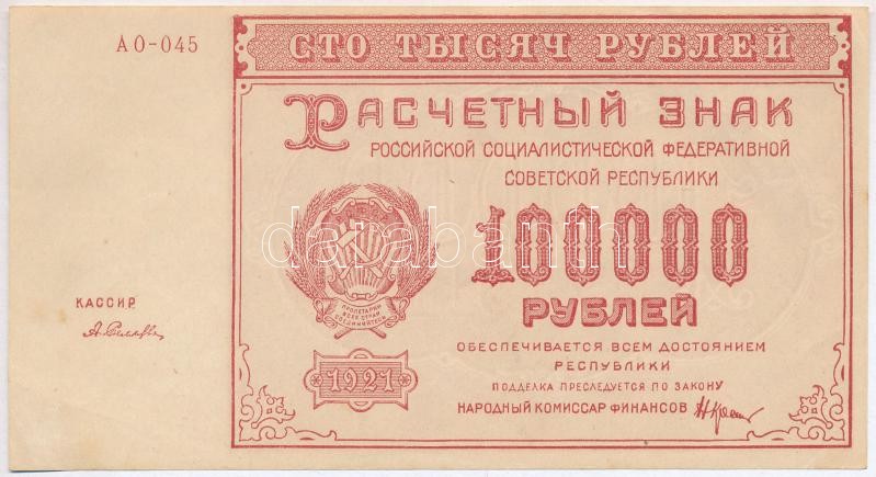 Szovjetunió / Orosz Szocialista Szövetségi Szovjet Köztársaság 1921. 100.000R T:II Soviet Union / Russian Socialist Federated Soviet Republic 1921. 100.000 Rubles C:XF Krause P#117.a<a href="https://www.darabanth.com/hu/gyorsarveres/409/kategoriak~N