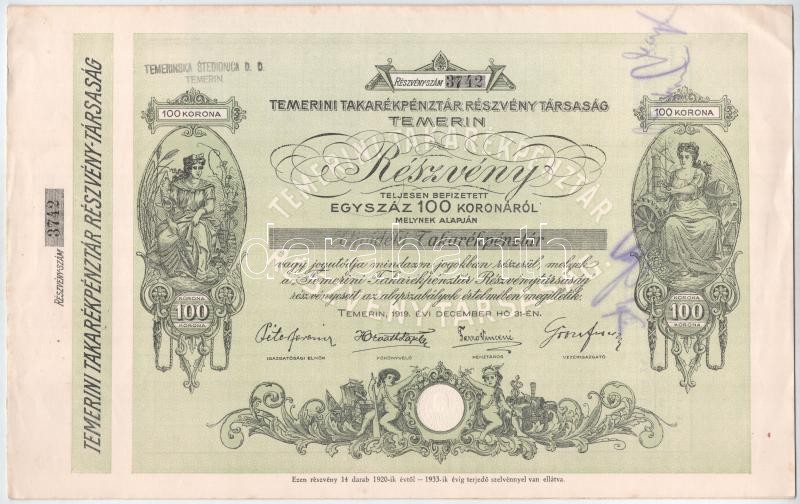 Temerin 1921. ‘Temerini Takarékpénztár Részvénytársaság’ részvénye 100K-ról, szelvényekkel, bélyegzésekkel és szárazpecséttel T:II Temerin 1921. ‘Temerin Savings Bank’ share about 100 Kronen, with coupons, overprints and ambossed stamp C:XF<a href="