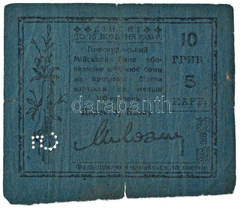 Ukrajna / Proskuriv (Hmelnickij) 1919. 10H ‘B 3397’ szükségpénz, jobb alsó sarokban ‘5’-ös perforációval T:F,VG / Ukraine / Proskuriv (Khmelnytskyi) 1919. 10 Hryvnias ‘B 3397’ with perforated number ‘5’ in the lower right corner C:F,VG