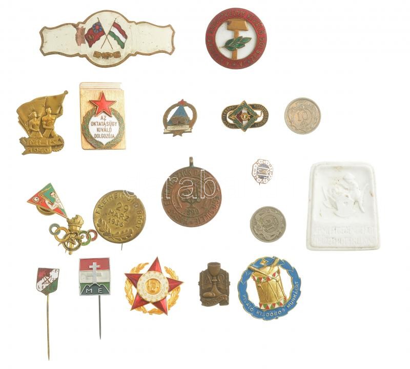 Vegyes 19db-os jelvény, kitűző tétel, közte 2db érme valamint ‘Kiváló Kisdobos Munkáért’, ‘A Kisipari Szövetkezet Kiválód Dolgozója’, ‘Lehel Polgári Lövész Egyesület’ jelvényei T:1–3
