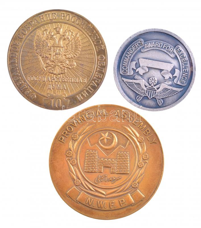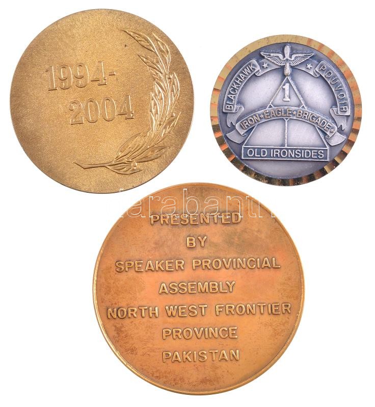 Vegyes: 3db-os külföldi emlékérem tétel, benne Pakisztán DN ‘Presented by Speaker Provincial Assembly North West Frontier Province Pakistan’ aranyozott bronz emlékérem (57mm), ‘Blackhawk Pouvoir – Iron Eagle Brigade – Old Ironsides’ ezüstpatinázott fém em