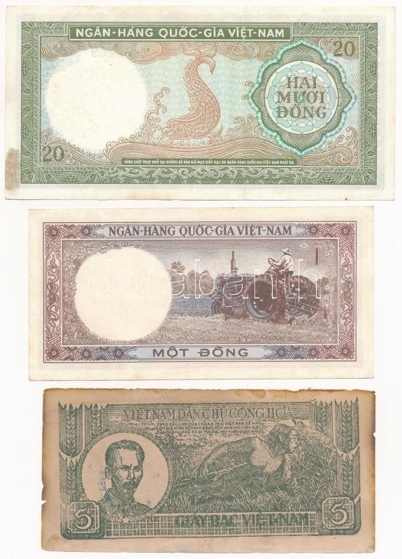 Vietnám 1948. 5D ‘GD 027177’ + DN (1964) 1D ‘J1 461737’ + 20D ‘F6 472269’ T:I–III folt, kis anyaghiány Vietnam 1948. 5 Dong ‘GD 027177’ + ND (1964) 1 Dong ‘J1 461737’ + 20 Dong ‘F6 472269’ C:AU-F spotted, small material error Krause P#15-17