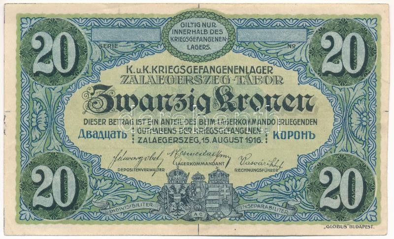 Zalaegerszeg / Hadifogolytábor 1916. augusztus 15. 20K sorozat- és sorszám nélkül, illesztővonalakkal (formulare) T:II hajtatlan, szamárfülek, kis beszakadás, fo. Adamo HHZ-1.8.5V<a href="https://www.darabanth.com/hu/gyorsarveres/432/kategoriak~Numi