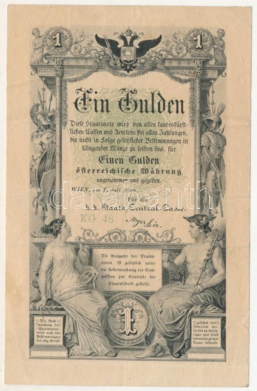 1866. 1G „STN” vízjeles papíron, „KG48” sorszámmal T:F / Austrian Empire 1866. 1 Gulden on „STN” watermarked paper, „KG48” serial number C:F Adamo G97