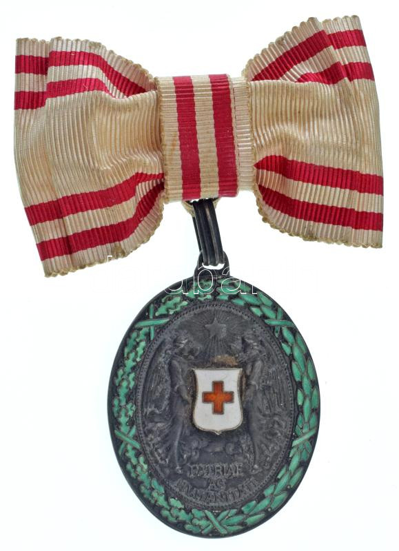 1914. „A Vörös Kereszt Ezüst Díszérme hadidíszítménnyel, női csokorszalagon” részben zománcozott, jelzett Ag kitüntetés eredeti mellszalaggal, eredeti, de sérült tokban T:AU Hungary 1914. „Red Cross, Silver Medal of Honour for women with a war decoration” partially enamelled Ag decoration with hallmark, with original ribbon, in original, but damaged case C:AU NMK 285.