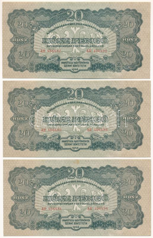 1944. 20P „A Vöröshadsereg Parancsnoksága” (3x) sorszámkövetők „AH 466482 – AH 466484” T:XF,VF / Hungary 1944. 20 Pengő „A Vöröshadsereg Parancsnoksága” (3x) consecutive serials „AH 466482 – AH 466484” C:XF,VF Adamo P45